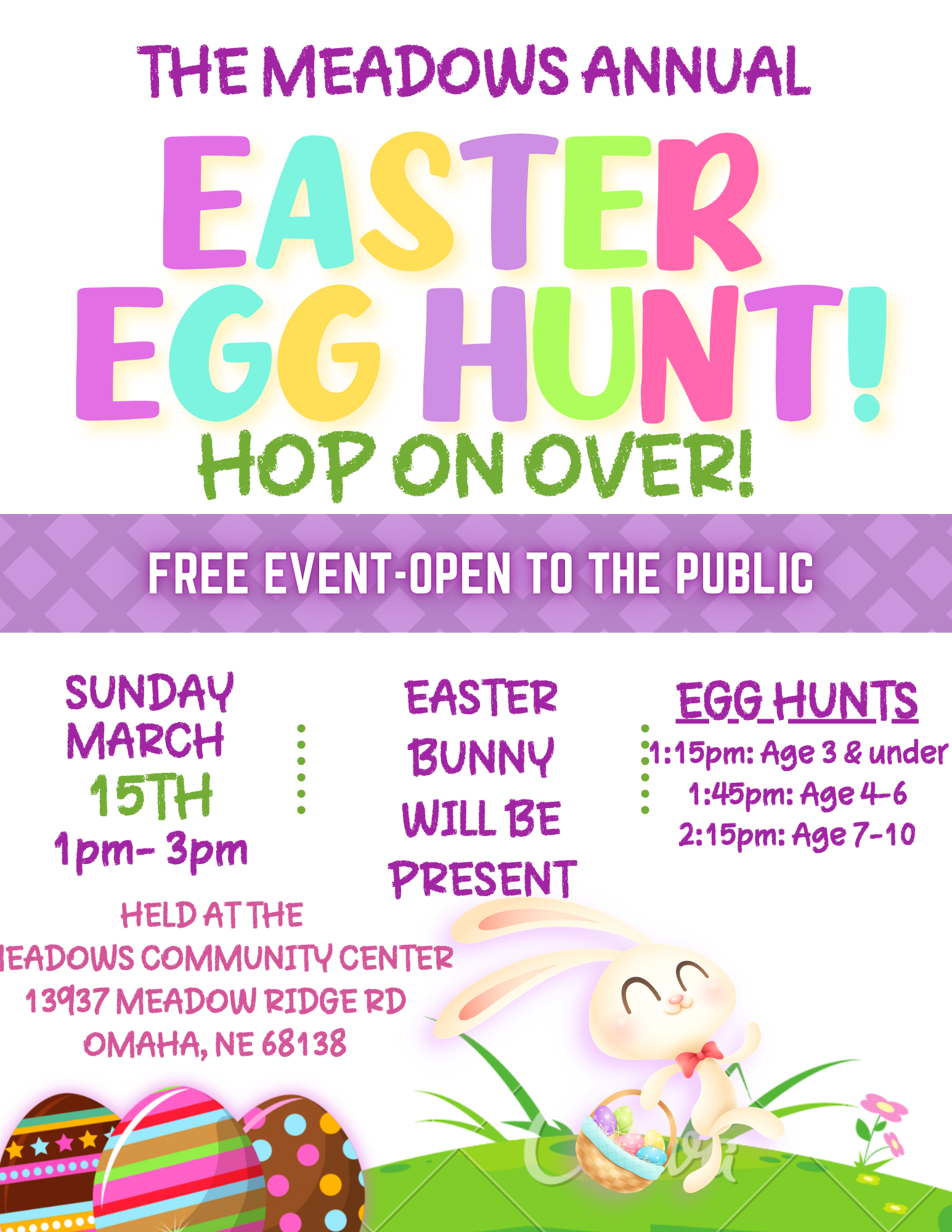 Come join us for our annual Easter Egg Hunt! We are bringing back our Egg Hunt! The Easter Bunny will be joining us! There will be pictures with the Easter Bunny and snacks. Pets are welcome. This is a free event and open to the public. Kids will hunt for eggs in designated areas for their age group during the designated times. After they hunt for the eggs, then they can turn in their eggs for a bag of goodies at the Egg Exchange. We look forward to seeing you there!